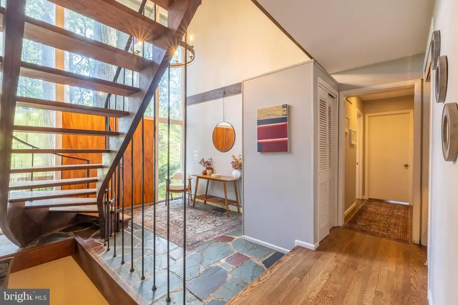 Unique Hockessin contemporary home in a wooded setting, situated on a .82 acre lot and backs to 54 acres of private open space. Upon entering you're greeted by a sun filled 2 story entry foyer. Gorgeous hardwood flooring runs through the first and second floor. The main level features kitchen with cherry cabinetry solid surface counter, backsplash, and opens to a breakfast area. A relaxing screened porch is located off breakfast area. An expansive dining room with brick fireplace could also be used as a living room. Two bedrooms, full bath, and laundry room complete the main level.