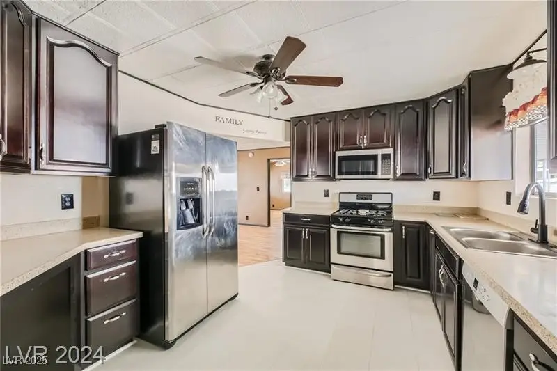 Immaculate 3 Bedroom, 2 Full Bath Manufactured Home Converted to Real Property in Age Restricted 55 Plus Community. Large Living Room / Formal Dining Room Combination ,Family Room and a Master Suite that is Separate from the other Bedrooms and on the Opposite End of the House add to the Appeal of this Spacious Single Story Floor Plan. House has Manmade Wood Look Flooring, Beautiful Wood Cabinetry and Stainless Steel Appliances. Owner Replaced the A/C and installed a Tankless Water Heater in the Summer of 2024. Low Maintenance Back Yard complete with a Shed, 2 Carports and Desert Landscaping in the Front Yard make this a Turn-Key Home!