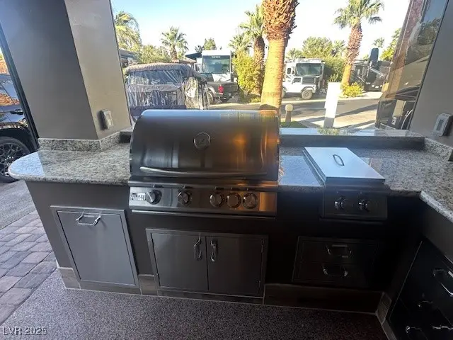 Located within the Class A Las Vegas Motorcoach Resort, this gorgeous stucco and stone build-out will exceed all your expectations. Featuring all stainless-steel appliances, granite counter tops, privacy wall, living area with TV and fireplace, built in shades, 2 mini splits, epoxy flooring, comfort station, and storage closet with water heater, water softener, and washer/dryer.