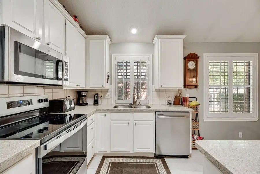Tastefully well-maintained one-story home on a cul-de-sac, near the community pool. This home features 3 bedrooms with a split bedroom floor plan, 2 bathrooms, 2 living areas, and two dining areas. There are brand new stainless steel appliances in the kitchen. Thanks to backing to the community greenbelt and walking path, the backyard feels spacious and luscious. New stainless steel appliances make this light and bright kitchen ready for your next get-together. The large primary bedroom features an en suite bathroom with separate shower and bath, and a walk-in closet. The living room is accented with a gas fireplace and large windows overlooking the beautiful backyard. The location of this home is the epitome of convenience, with both highways I-35 and W-35 just a hop, skip, and jump away as well as countless tasty restaurants and great shopping.